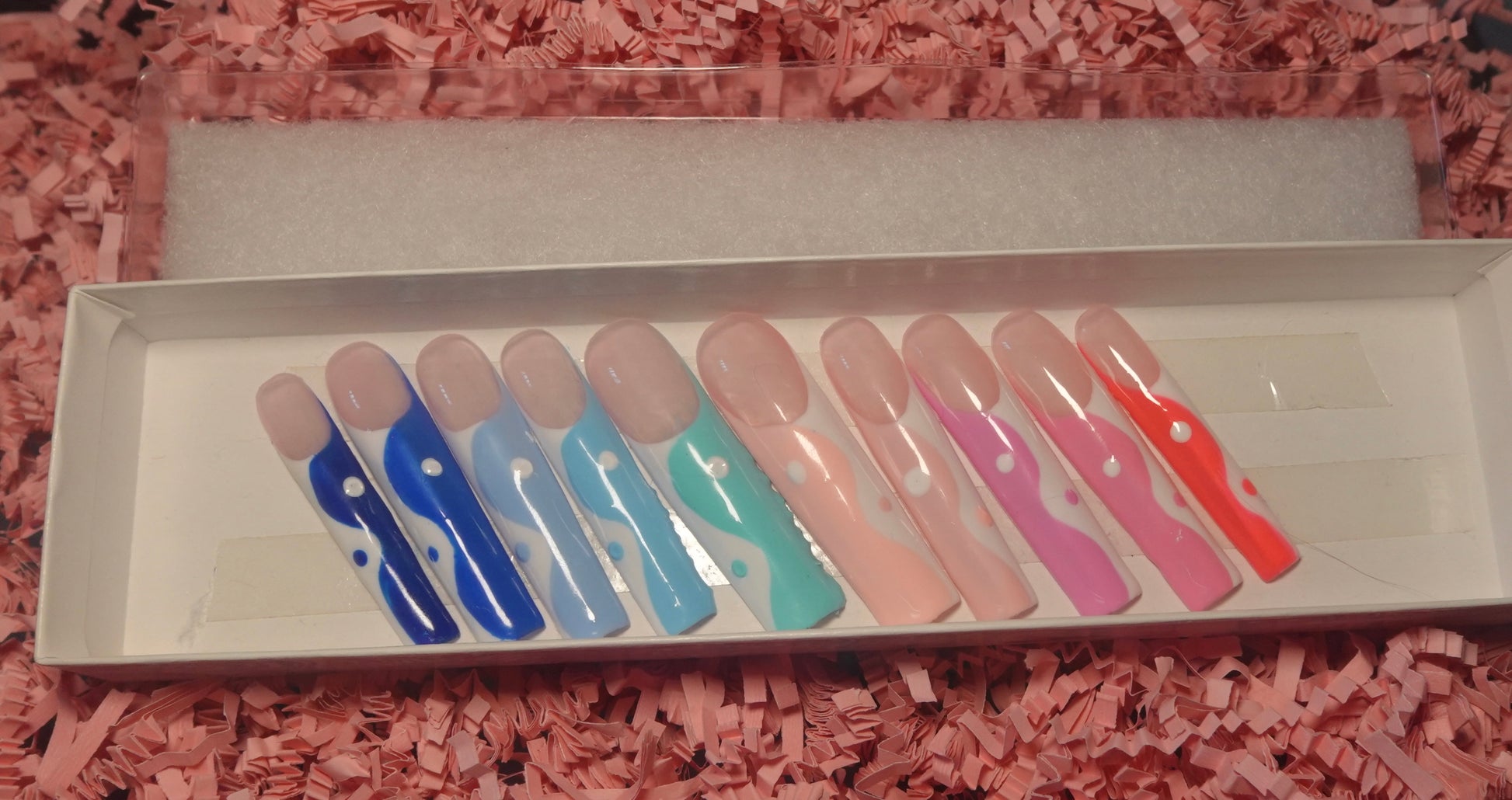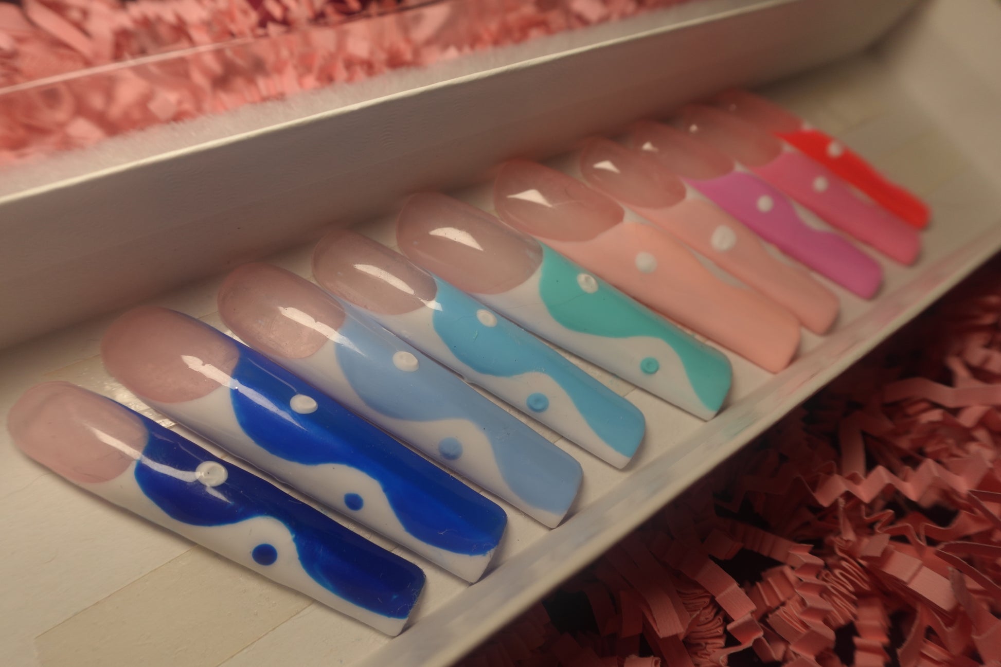 Bring a burst of color to your fingertips with Cotton Candy Wave — a playful, pastel press-on nail set featuring dreamy swirls of blue, pink, peach, and coral over a glossy nude base. This fun, vibrant design is perfect for spring and summer, giving you a bold pop of color while still feeling soft and wearable.